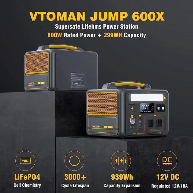 Capacity Expandable to 939WhVTOMAN Jump600X portable power station has a capacity of 299Wh, and it can be further expanded to 939Wh with VTOMAN Jump600X Extra Battery (Sold separately) to meet more of your daily power needs. Besides, the built-in premium LiFePO4 (LFP) battery features 3, 000 full life cycles before getting down to 80% of its original capacity, which is a long-lasting power station that can meet both daily needs and long-term use.