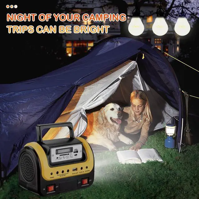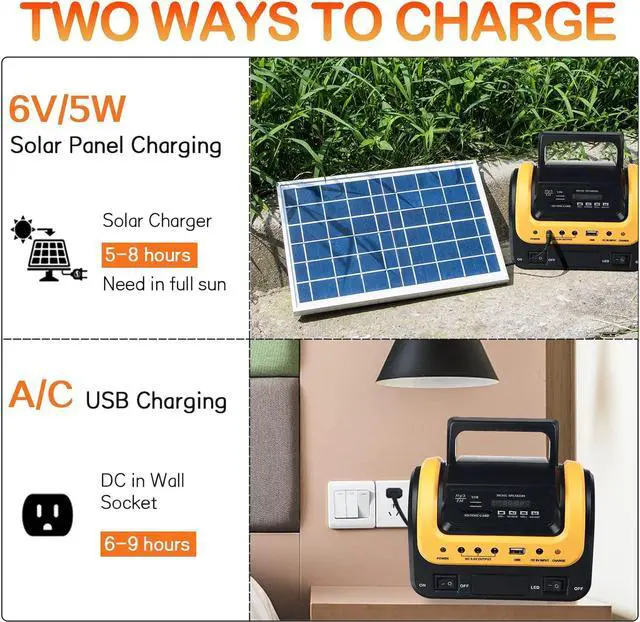 2 CHARGING WAYS Power Generator- Our outdoor generator provides 2 charging ways. 5W solar panel charging and AC charging. With and light bulbs, convenient to carry, Compact design, easy installation. Anti-dust, DC& USB output, safe and reliable. Integrated packing, easy transportation.