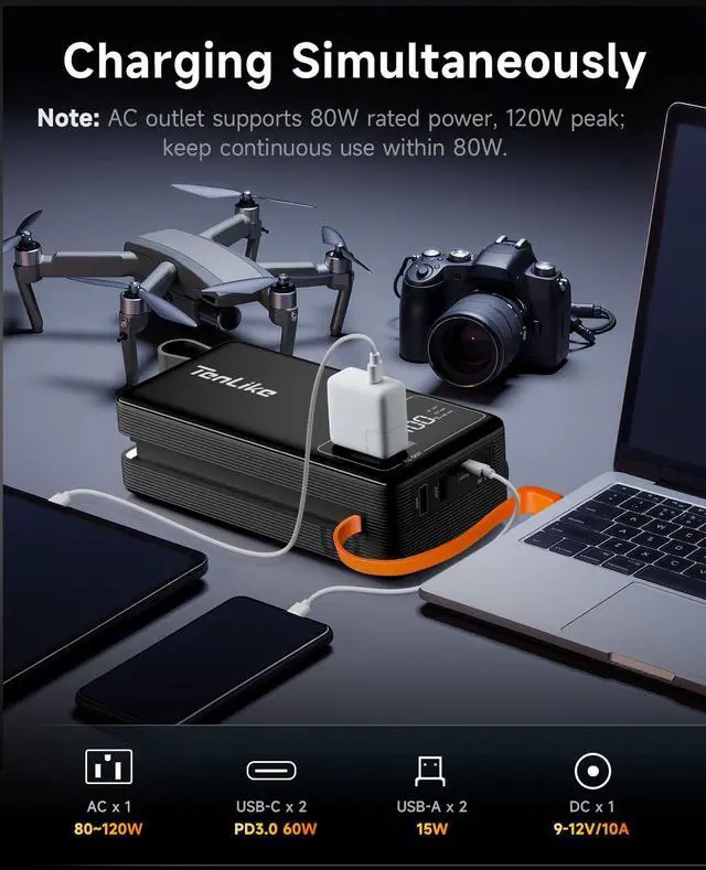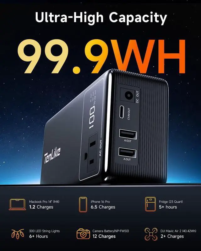 99.9Wh High-Capacity BatteryWith an impressive 99.9Wh battery capacity, our Tenlike portable power station ensures that you can keep your devices powered for extended periods, whether youre camping, traveling, or facing a power outage at home. Note: 99.9Wh is the maximum capacity allowed by airlines