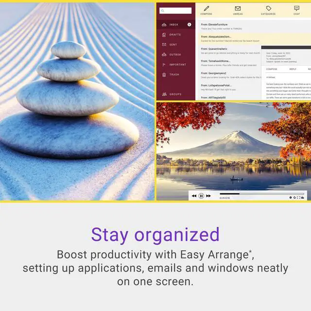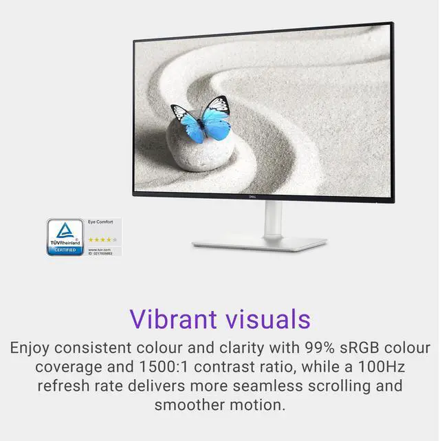 A 27-inch FHD monitor that optimizes eye comfort and features impressive visuals with outstanding acoustics in a lifestyle-inspired design. With clear FHD resolution, high 100Hz refresh rate, integrated dual 5W speakers and subtle texture on the back inspired by Japanese sand raking, any activity becomes an immersive experience. Enjoy more detailed sound with spacious audio featuring greater output power, deeper frequency response and more decibel range than the previous generation. Choose your audio experience with six preset profiles: Standard, Movie, Game, Music, Voice, and one customizable profile. Reduce harmful blue light emissions without sacrificing color accuracy with TÜV Eye Comfort 4-star rated Dell's Improved ComfortView Plus.