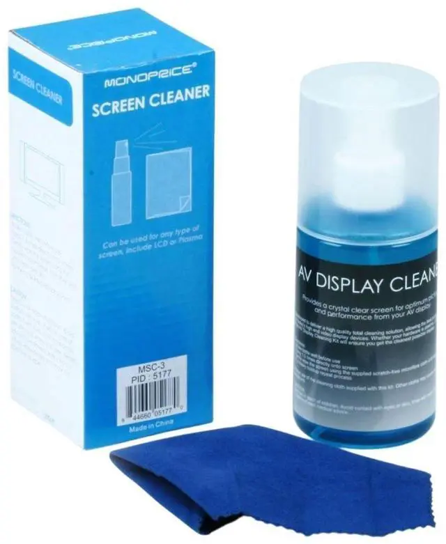 Monoprice Universal Screen Cleaner for LCD and Plasma TVs, Smartphones, and Tablets (Large Bottle)You may not have noticed, but after a while, your bright and beautiful screen may have lost some of its original luster. Much of that is probably due to airborne dust and dirt that have accumulated on the screen's surface. This thin layer of dirt reduces your screen's clarity, brightness, and color accuracy. The solution is simple - give it a good cleaning. Sadly, many household cleaners contain active ingredients that can damage your screens sensitive surface. Many screens have special coating that can be broken down if you use the wrong cleaning cleaners and clothes. The Monoprice Universal Screen Cleaner is great for all kinds of LCD displays, including portable devices such as Android devices, iOS devices (iPad, iPhone, iPod), and other smartphones and tablets. Monoprice cleaning kits come with specially formulated solutions designed specifically for modern electronics and microfiber cleaning clothes that will not scratch delicate surfaces. The cleaning liquid is alcohol-free and leaves a streak-free finish. Easily remove the fingerprints and grime from your screen.