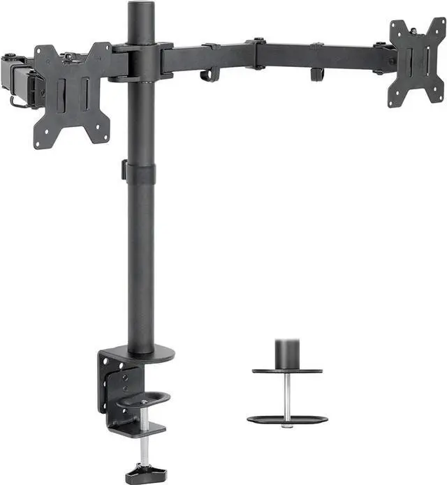 Dual monitor stand with heavy duty desk clamp for mounting on the back of desks with fully adjustable arms.
