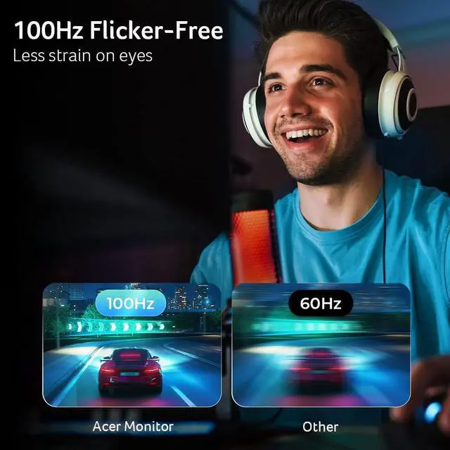 Eye Safety First Stay in the fight for hours with Acer EyeProtect's Flicker-less, Blue Light Filter, ComfyView, and Low-dimming technology. These features take into consideration prolonged usage and minimize eye strain from long gaming sessions.