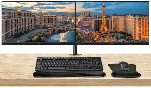Accessories: Dual monitor stand with heavy duty desk clamp for mounting on the back of desks, detachable bracket plates and fully adjustable arms. Gel Mouse & Keyboard Wrist Rest Set