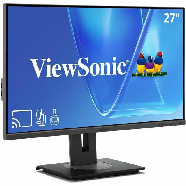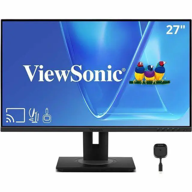 The ViewSonic (r) VG2748N monitor delivers a streamlined, cable-free workspace experience. This 27" Full HD IPS display features integrated WiFi technology enabling effortless wireless casting via Miracast and Airplay, while the included ViewShare dongle can support 65W USB-C power delivery when connected to a power source-keeping devices charged without extra cables. For added flexibility, the monitor includes HDMI, DisplayPort, and VGA inputs for connecting other devices, along with a built-in USB hub for accessories. An advanced ergonomic stand supports tilt up to 40 degrees, swivel, pivot, and height adjustment for all-day comfort.