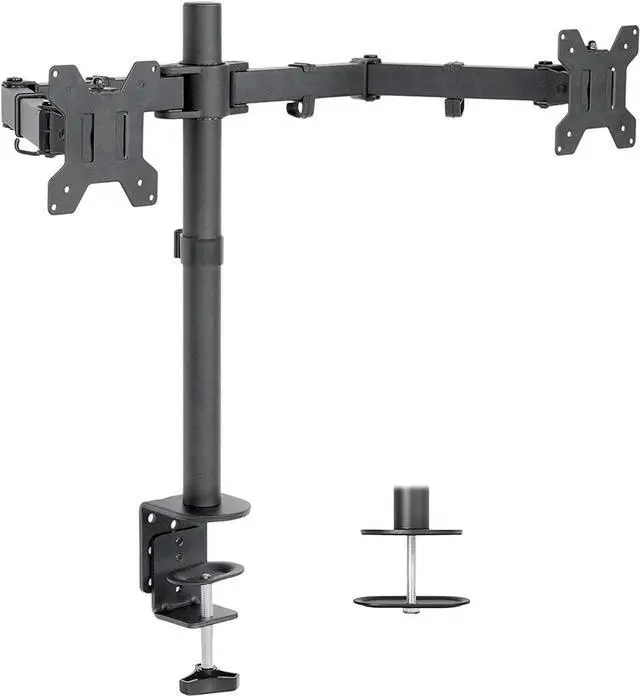 Accessories: Dual monitor stand with heavy duty desk clamp for mounting on the back of desks, detachable VESA bracket plates and fully adjustable arms. Gel filled wrist rest for Mouse and Keyboard.