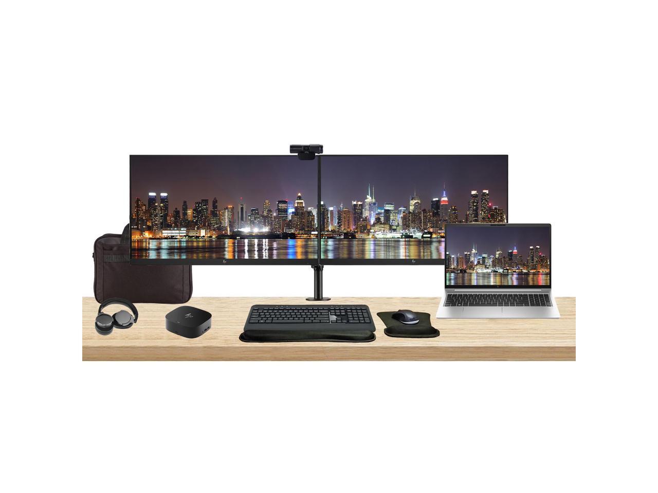 HP EliteBook 655 G10 15.6" Ryzen 7, 32GB RAM, 1TB SSD, Windows 11 Pro Notebook Bundle with 2 x EliteDisplay E27 27" Monitors, Dual Stand, USB-C Dock, Keyboard and Mouse, Webcam, Headphones, Bag
