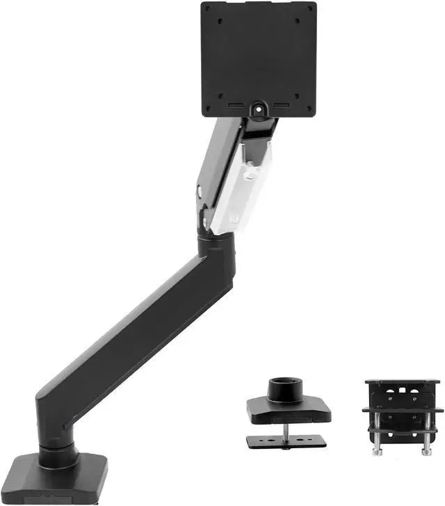 Single monitor stand with heavy duty desk clamp for mounting on the back of desks with fully adjustable arms.