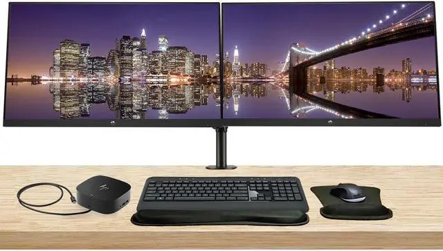 Accessories: Dual monitor stand with heavy duty desk clamp for mounting on the back of desks, detachable ARM bracket plates and fully adjustable arms