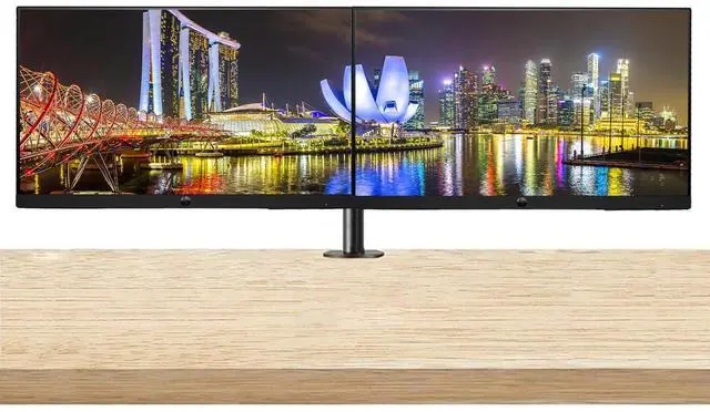 This dual-monitor desk mount supports two screens with standard 75x75 mm or 100x100 mm mounting. Its sturdy steel construction, full tilt and swivel adjustment, and height-adjustable arms help create a cleaner, more ergonomic workspace. Includes both clamp and grommet mounting options for flexible setup.
