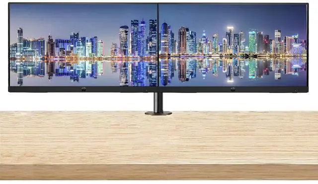 This dual-monitor desk mount supports two screens with standard 75x75 mm or 100x100 mm mounting. Its sturdy steel construction, full tilt and swivel adjustment, and height-adjustable arms help create a cleaner, more ergonomic workspace. Includes both clamp and grommet mounting options for flexible setup.