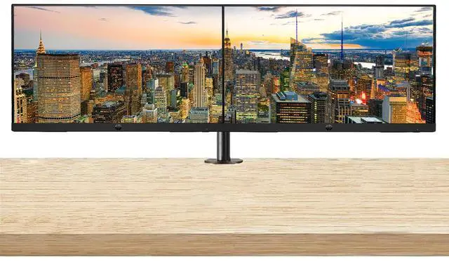 This dual-monitor desk mount supports two screens with standard 75x75 mm or 100x100 mm mounting. Its sturdy steel construction, full tilt and swivel adjustment, and height-adjustable arms help create a cleaner, more ergonomic workspace. Includes both clamp and grommet mounting options for flexible setup.