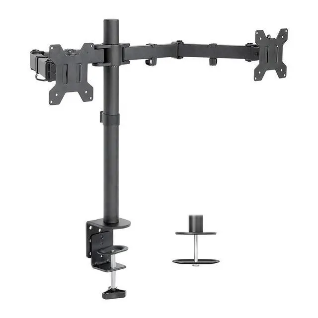 This dual-monitor desk mount supports two screens with standard 75x75 mm or 100x100 mm mounting.