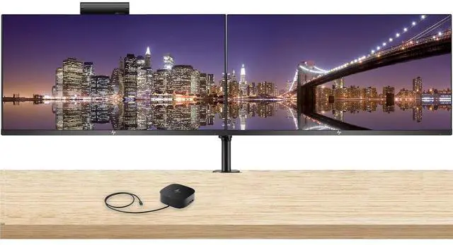 This dual-monitor desk mount supports two screens with standard 75x75 mm or 100x100 mm mounting.