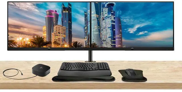 Upgrade your workspace with this complete dual HP Series Pro monitor bundle-featuring two premium displays on a sleek desk mount, a USB-C multiport dock for clean, single-cable connectivity, and an MK670 wireless keyboard and mouse combo with a wrist rest and gel pad for all-day comfort and productivity.