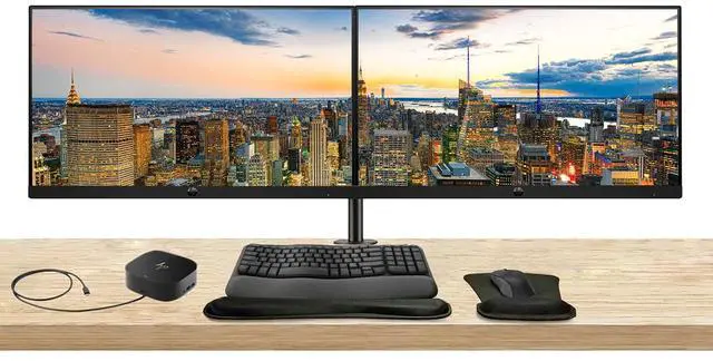 Upgrade your workspace with this complete dual HP Series Pro monitor bundle-featuring two premium displays on a sleek desk mount, a USB-C multiport dock for clean, single-cable connectivity, and an MK670 wireless keyboard and mouse combo with a wrist rest and gel pad for all-day comfort and productivity.
