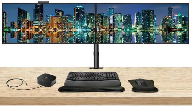 Upgrade your workspace with this complete dual HP Series Pro monitor bundle-featuring two premium displays on a sleek desk mount, a USB-C multiport dock for clean, single-cable connectivity, and an MK670 wireless keyboard and mouse combo with a wrist rest and gel pad for all-day comfort and productivity.