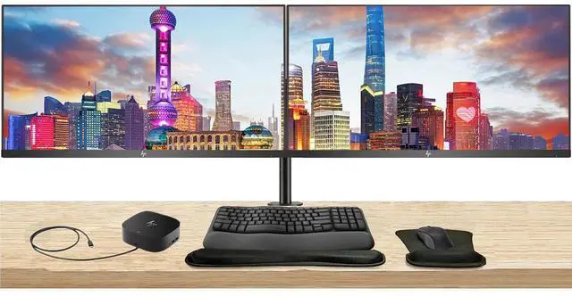 Upgrade your workspace with this complete dual HP Series Pro monitor bundle-featuring two premium displays on a sleek desk mount, a USB-C multiport dock for clean, single-cable connectivity, and an MK670 wireless keyboard and mouse combo with a wrist rest and gel pad for all-day comfort and productivity.
