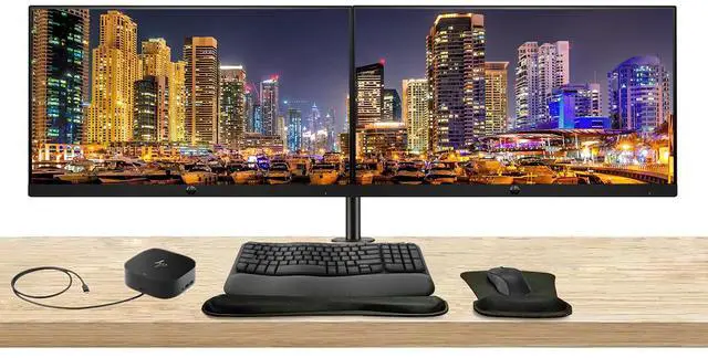 Upgrade your workspace with this complete dual HP Series Pro monitor bundle-featuring two premium displays on a sleek desk mount, a USB-C multiport dock for clean, single-cable connectivity, and an MK670 wireless keyboard and mouse combo with a wrist rest and gel pad for all-day comfort and productivity.