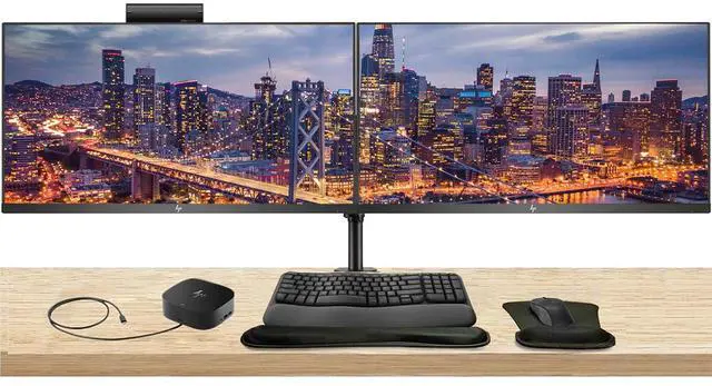 Upgrade your workspace with this complete dual HP Series Pro monitor bundle-featuring two premium displays on a sleek desk mount, a USB-C multiport dock for clean, single-cable connectivity, and an MK670 wireless keyboard and mouse combo with a wrist rest and gel pad for all-day comfort and productivity.