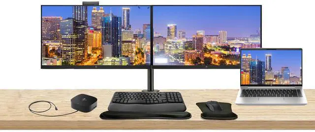 Upgrade your workspace with this complete dual HP Series Pro monitor bundle-featuring two premium displays on a sleek desk mount, a USB-C multiport dock for clean, single-cable connectivity, and an MK670 wireless keyboard and mouse combo with a wrist rest and gel pad for all-day comfort and productivity.