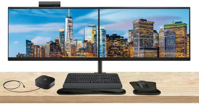 Dual HP Series Pro monitor bundle-featuring two premium displays on a sleek desk mount, a USB-C multiport dock and an MK650 wireless keyboard and mouse combo with a wrist rest and gel pad.