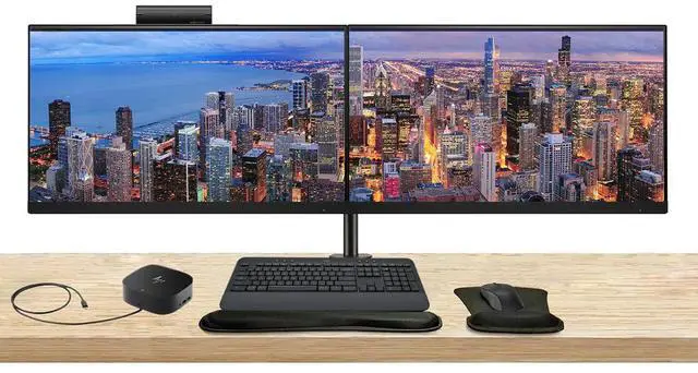 Dual HP Series Pro monitor bundle-featuring two premium displays on a sleek desk mount, a USB-C multiport dock and an MK650 wireless keyboard and mouse combo with a wrist rest and gel pad.