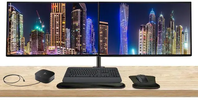 Upgrade your workspace with this complete dual HP Series Pro monitor bundle-featuring two premium displays on a sleek desk mount, a USB-C multiport dock for clean, single-cable connectivity, and an MK650 wireless keyboard and mouse combo with a wrist rest and gel pad for all-day comfort and productivity.