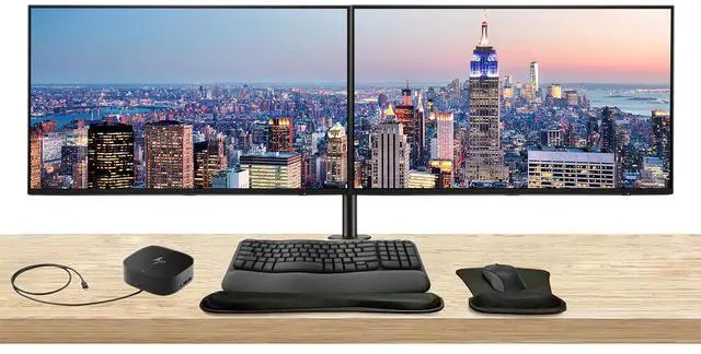 Upgrade your workspace with this complete dual HP Series Pro monitor bundle-featuring two premium displays on a sleek desk mount, a USB-C multiport dock for clean, single-cable connectivity, and an MK650 wireless keyboard and mouse combo with a wrist rest and gel pad for all-day comfort and productivity.
