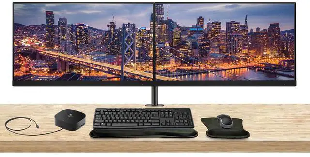 Upgrade your workspace with this complete dual HP Series Pro monitor bundlefeaturing two premium displays on a sleek desk mount, a USB-C multiport dock for clean, single-cable connectivity, and an MK270 wireless keyboard and mouse combo with a wrist rest and gel pad for all-day comfort and productivity.