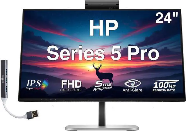 HP Series 5 Pro 24" FHD IPS Monitor with 5ms Response Time, Anti-Glare, Flicker Free, 350 nits Brightness, VESA Mount (100mm), Displayport, HDMI & Dockztorm USB Port Expander, Black/Silver