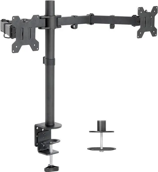 Accessories: Dual monitor stand with heavy duty desk clamp for mounting on the back of desks, detachable bracket plates and fully adjustable arms.