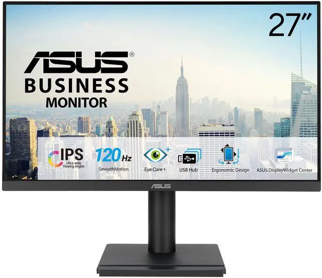 ASUS VA279QGS Business Monitor - 27-inch, IPS, Full HD, Frameless, 120Hz, Adaptive-Sync, 1ms MPRT, HDMI, DisplayPort, VGA, Low Blue Light, Flicker Free, Ergonomic Design, Wall Mountable27-inch Full HD (1920x1080) frameless design with IPS 178° wide viewing angle panelSmoothMotion 120Hz refresh rate and 1ms MPRT delivers a seamless, tear-free visual experience by enabling VRR (variable refresh rate) Rich connectivity features HDMI, DisplayPort and VGA, plus earphone jackVESA wall-mountable to save on desktop spaceErgonomic design with tilt, swivel, pivot and height adjustments for a comfortable viewing experienceASUS DisplayWidget Center lets users easily change monitor settings via an intuitive interfaceASUS Eye Care monitors feature T? V Rheinland-certified Flicker-free and Low Blue Light technologies to ensure a comfortable viewing experienceASUS Business Monitor | Enhance Your ProductivityA