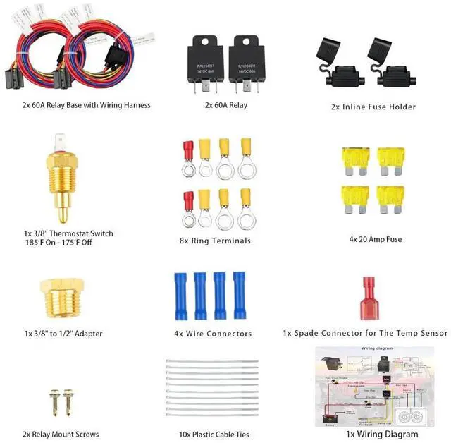 Efficient Cooling: This Dual Electric Fan Relay Kit Is The Perfect Solution For Your VehicleS Cooling System. Compatible With 10", 12", 14", And 16" Fans, It Includes A 60 Amp Relay, 4-Pin Relay, And Relay Switch. Whether You'Re Upgrading Your System With An Electric Fan Conversion Kit Or Replacing Old Components, This Electric Radiator Fan Kit Ensures Efficient Cooling And Prevents Engine Overheating, Providing Reliable Performance When You Need It Most
