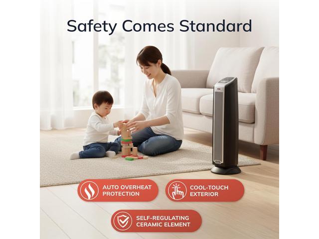 - Built-in safety features include overheat protection, a safe ceramic element and a cool-touch exterior