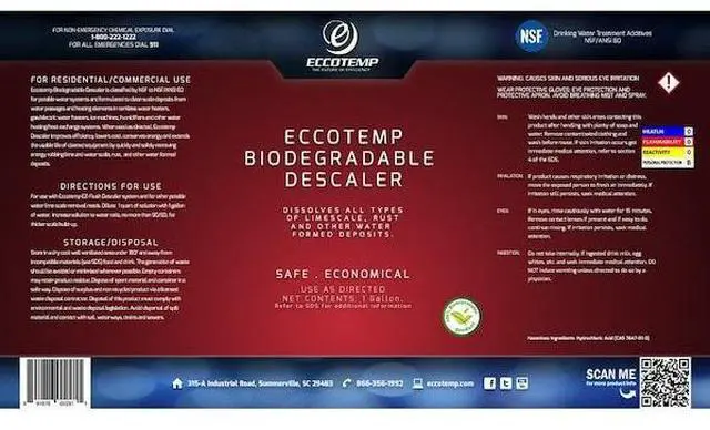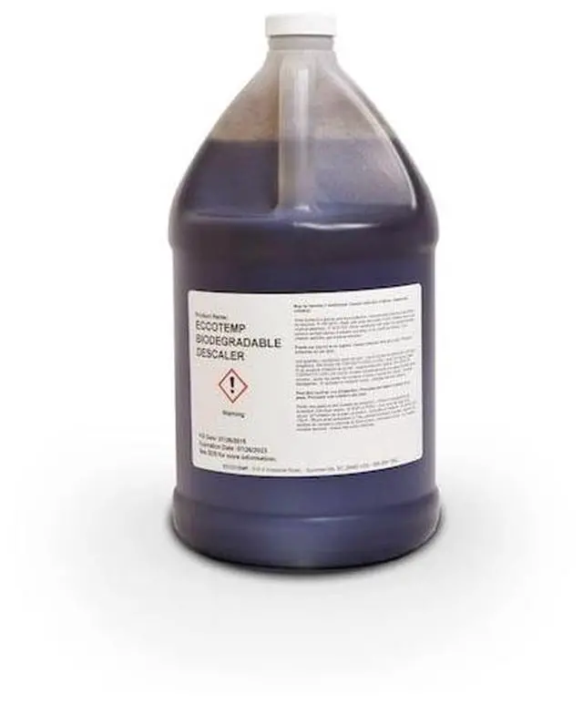 The Eccotemp System Descaler is made to quickly dissolves water scale, lime, rust, and other water formed deposits, restoring efficiency to most all appliances. The Eccotemp System Descaler is a non-toxic concentrate which is certified to NSF/ANSI 60 for use as a cleaner in potable water systems.