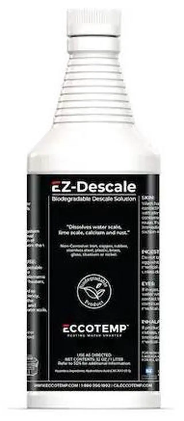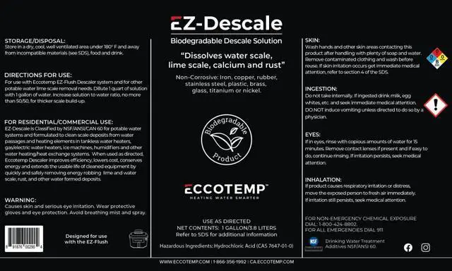 The Eccotemp System Descaler is made to quickly dissolves water scale, lime, rust, and other water formed deposits, restoring efficiency to most all appliances. The Eccotemp System Descaler is a non-toxic concentrate which is certified to NSF/ANSI 60 for use as a cleaner in potable water systems.