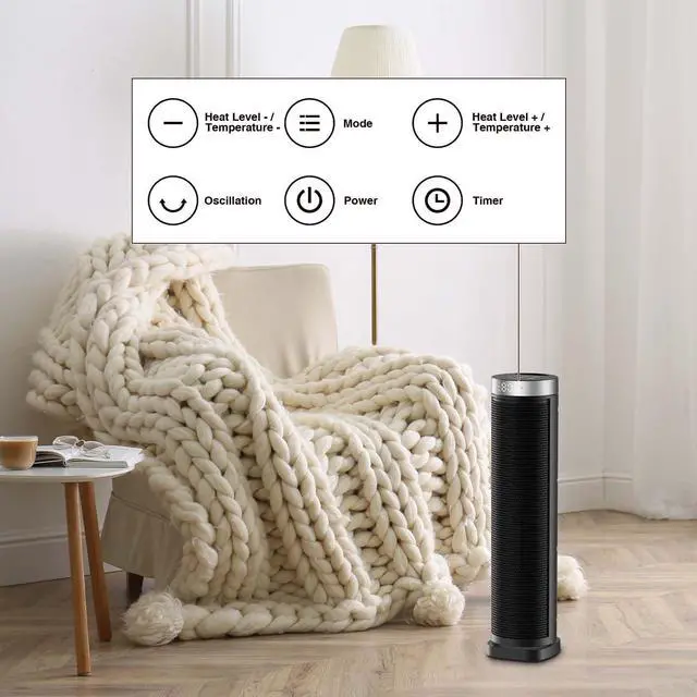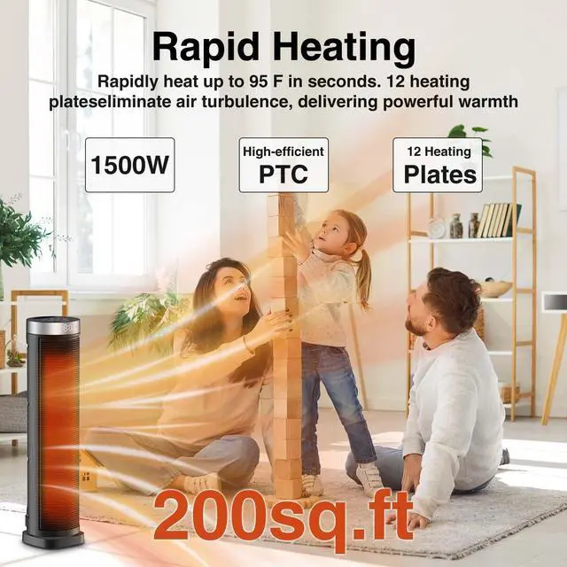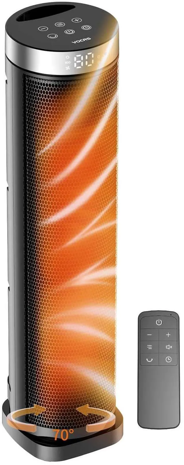 This 24-inch space heater features a 70° wide-angle oscillation for fast and even heat distribution, significantly enhancing overall heating efficiency. Equipped with a remote control, it allows easy operation from a distanceadjust temperature, modes, and timer settings without leaving your seat. Utilizing advanced PTC ceramic heating technology, it heats up quickly with safe and stable performance while being energy-efficient. The sleek and modern design fits seamlessly into bedrooms, living rooms, or office spaces. Its quiet operation ensures it wont disturb your sleep or work. Built-in safety features include tip-over protection and overheat auto shut-off, keeping your family safe.