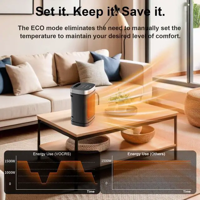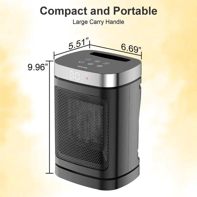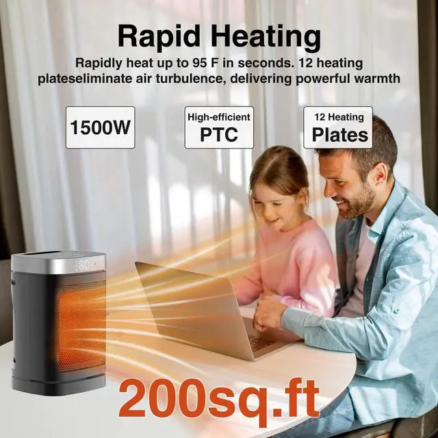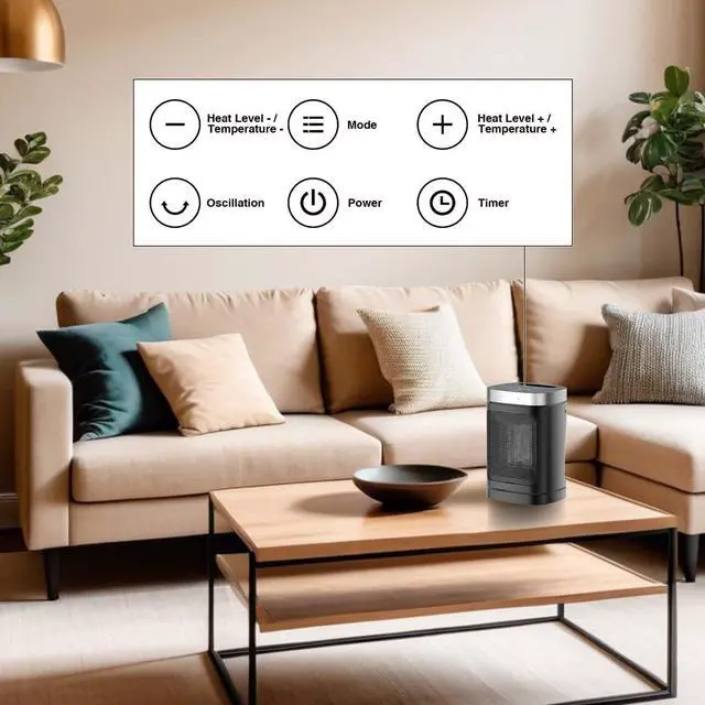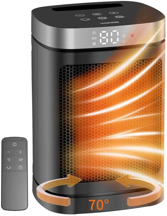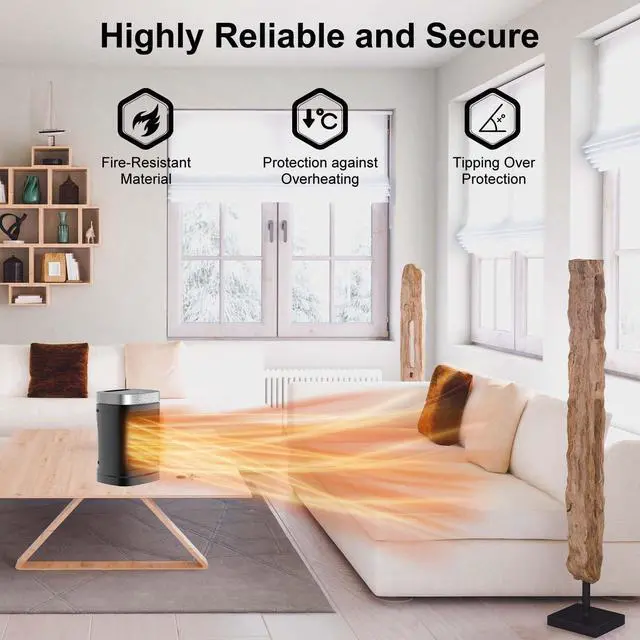 This portable space heater features advanced PTC ceramic heating technology for fast and efficient warmth. With a 70° oscillation function, it evenly distributes heat throughout the room, making it ideal for home, bedroom, office, and other indoor spaces. The electric heater offers three heating modes to suit different temperature needs and includes a convenient remote control for easy operation. Designed with safety in mind, it comes with overheat protection and a tip-over switch to ensure secure use. Compact and lightweight, this space heater is easy to move and store, providing warmth wherever you need it.