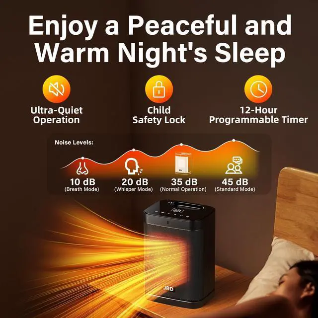The desk heater features handy extras for a hassle-free experience (12-hour timer, child lock). Safe for families with children and pets.