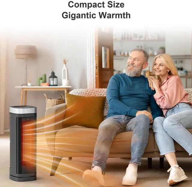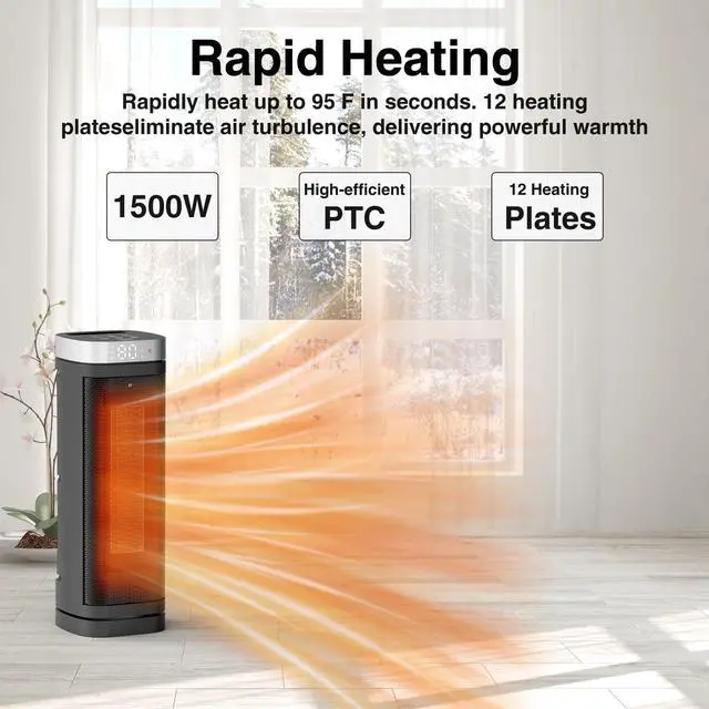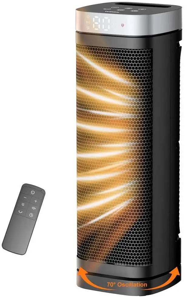 This 1500W portable space heater features advanced PTC ceramic heating technology for rapid and energy-efficient warmth. Designed for indoor use, it quickly heats up bedrooms, offices, and other small spaces. Compact and lightweight, its easy to move and place wherever needed. Equipped with a remote control for convenient operation, you can adjust temperature, fan speed, and timer settings without getting up. Built-in overheat protection and tip-over shut-off ensure safe use, making it ideal for homes with children or pets. A perfect heating solution for staying warm and cozy during the winter.