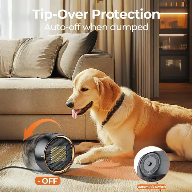 • [Multiple Safety Features] Our small space heater is crafted from high-temperature resistant, flame-retardant materials. It includes automatic overheat and tilt protection for added safety. insulation shell, and enhanced safety plug. The flip switch at the bottom automatically shuts off the heater if it tips over.