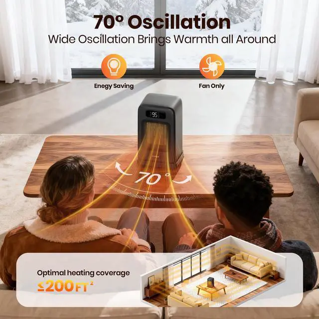 2-in-1 Functionality small space heaters for indoor use: This portable heaters for indoor use combines two heating modes (1500W/900W) with a fan function. Room heater for office space heater paired with ECO mode, desk heater for office space heater automatically adjusts power output based on ambient temperature differences (41-95), unifying energy efficiency with comfort to meet heating needs across all seasons