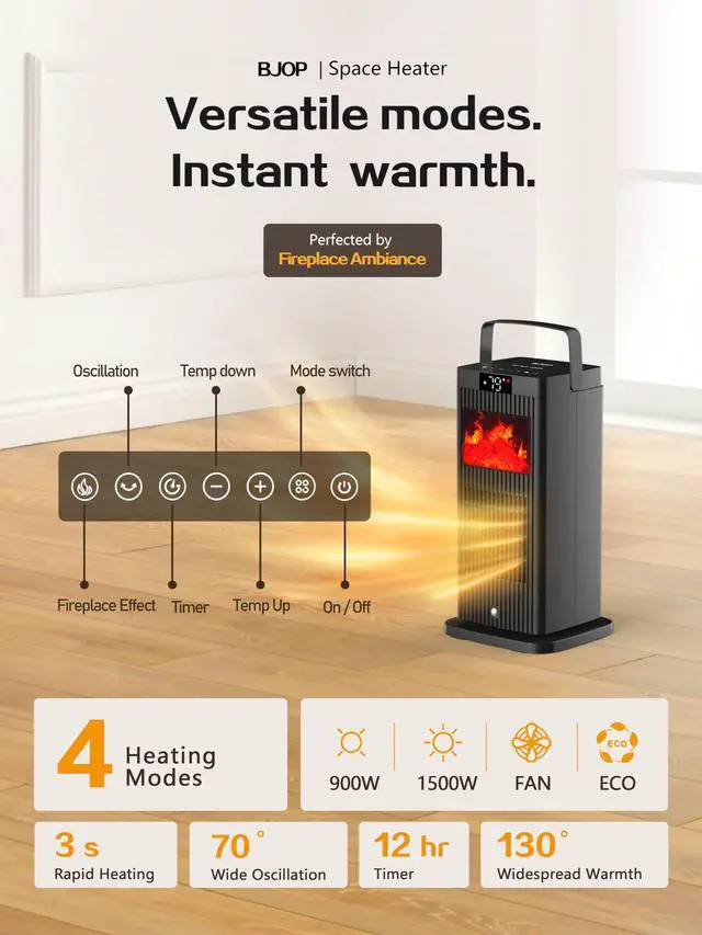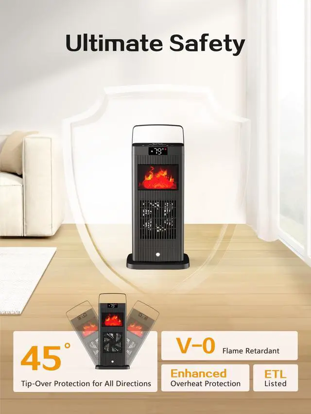 ETL & UL Certified Safety with Advanced FeaturesThis ETL-certified space heater ensures safety with tip-over and overheat protection, plus a delayed shutdown feature. It shuts off at 149°F and reheats as needed. Operating in 4 modesECO, Low (900W), High (1500W), and Fanit maintains quiet 35 dB performance. The built-in thermostat adjusts between 41°F and 95°F, automatically pausing and resuming heating to save energy. Safe for homes with kids and pets, it shuts off if tipped or overheated.