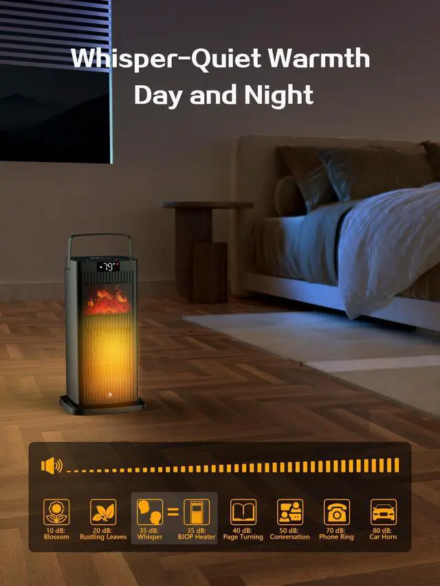 Ultra-Quiet Space Heater with Advanced TechnologyThis PTC electric ceramic portable heater features advanced ultra-quiet technology, operating at just 35-40 dBsimilar to the quiet of a library. The fan's oblique airflow design reduces noise by 12% compared to traditional heaters, ensuring a peaceful environment. Ideal for bedrooms, studies, and offices, it provides warmth without disruption, allowing you to sleep, work, and study in comfort.