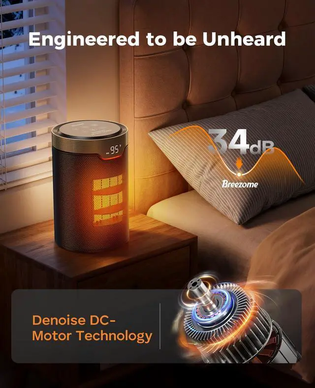 QUIET SLEEP EXPERIENCE & EASY OPERATION: With Denoise Motor Technology, this heater operates quietly at just 34 dB on the lowest setting (H1), providing a peaceful environment for sleeping or working. The display screen can be turned off, and the indicator lights brightness automatically adjusts to 50% to avoid disturbances. Remote control make everything easy!