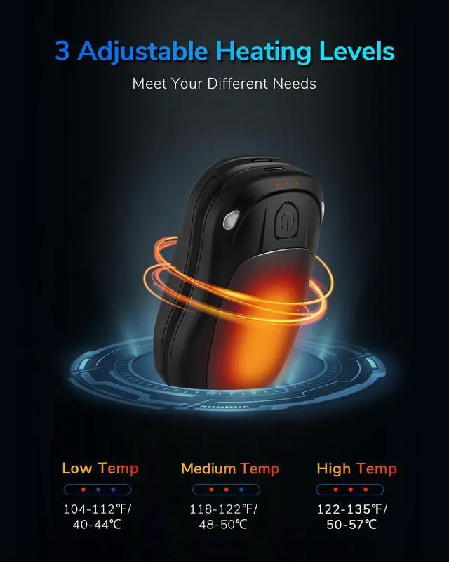 Comes with 3 heat levels, choose from low, medium or high temperature modes of the hand warmers for personal comfort, giving you flexibility and control over the amount of warmth you want.