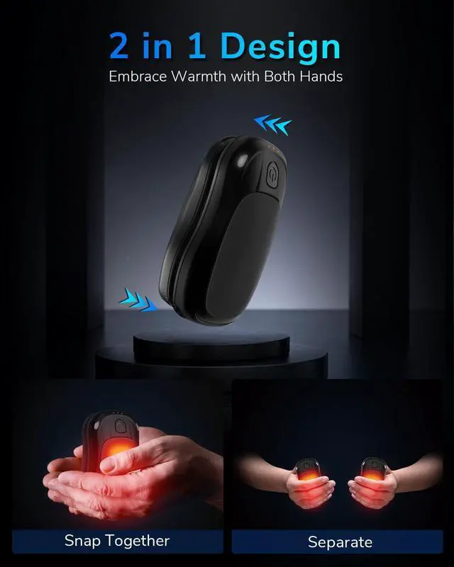 • 2-Pack Hand WarmersExperience the convenience of innovative 2 in 1 design hand warmers rechargeable, conquer any winter day with warmth and comfort. The two magnetic hand warmers combined for use or separate them to warm both hands at the same time, as well as share the warmth with your family and friends. Enjoy double the warmth.