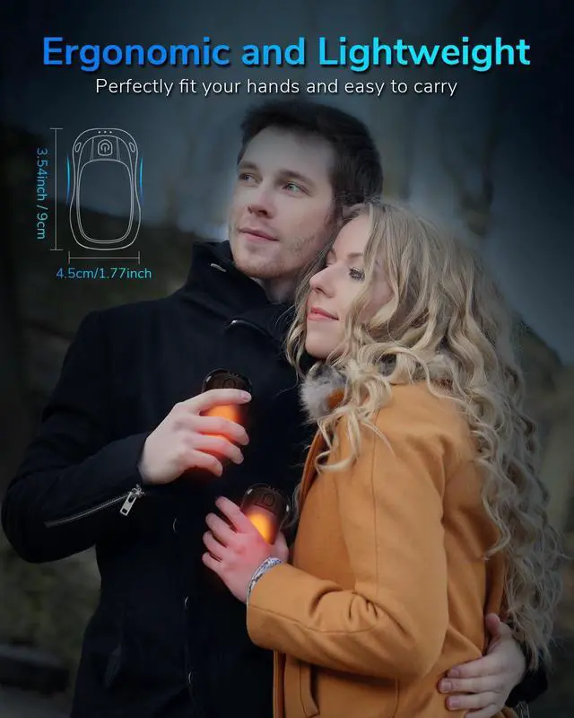 • Lightweight and Ergonomic DesignEngineered with comfort in mind, the portable hand warmers feature a pocket-size, lightweight, and sleek design, perfectly fit large or small hands. With maximum energy and minimal weight, it's ideal for extended outdoor activities, like hunting, camping, golfing, fishing, skiing, climbing, hiking, and jogging. Keep your hands toasty whatever the weather is going outside.