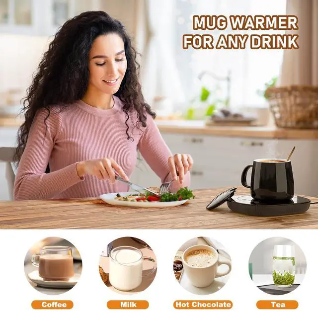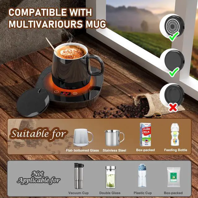Compatible Coffee Cup Warmer for Multifarious MugsOur intelligent coffee mug warmer recognizes when your mug is removed and automatically shuts off, enhancing energy efficiency. The oversized 4.7" heating area heats coffee quickly and evenly, letting you enjoy your drink without delay. Whether using a ceramic mug, delicate glass, or even a baby's milk bottle, this mug warmer accommodates various vessels for your convenience. For best results, select a mug with a lid, thin walls, and a flat bottom.